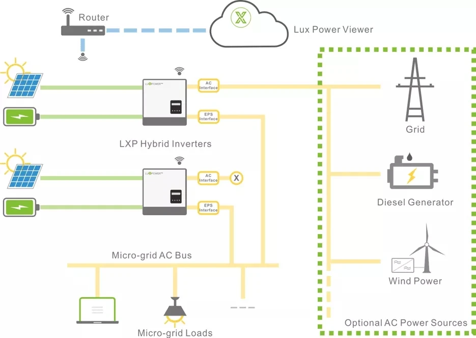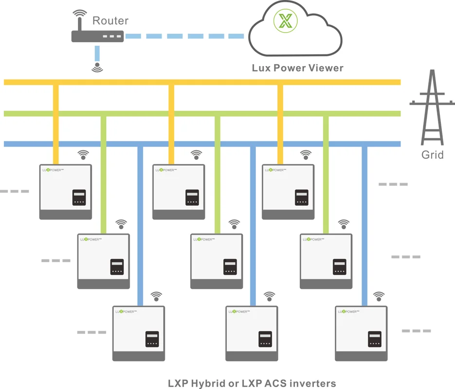 Гібридний інвертор LXP серії MG підтримує функцію паралельного підключення. Це означає, що користувачі можуть легко продовжити своє відключення електроенергії. Через удосконалений метод управління, є деякі переваги для паралельної системи: