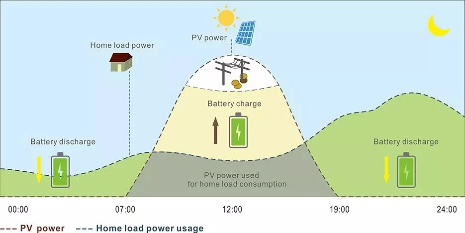 1. Режим самостійного споживання : Сонячний гібридний інвертор спочатку використовуватиме сонячну енергію для навантаження будинку, ліва Сонячна енергія використовуватиметься для заряджання батареї. Після заряджання акумулятора гібридного інвертора Сонячна енергія може подаватися до мережі.